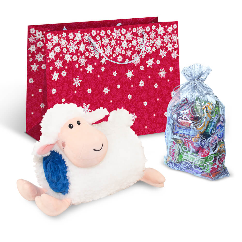 Набор "Кузя" в новогоднем пакете с мягкой муфтой овечкой и мешочком со сладким подарком 300г Премиум.