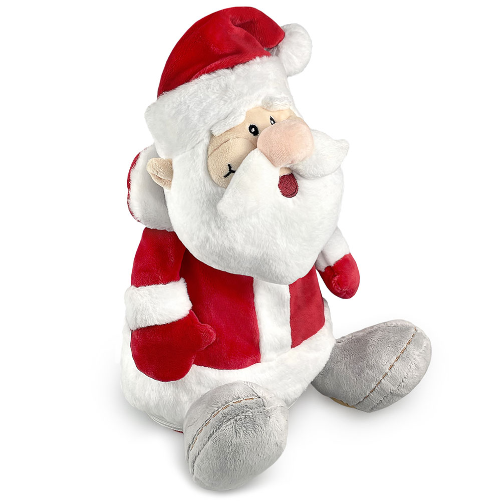 Широко улыбающийся Дедушка Мороз с густой бородой, в классическом костюме с отделкой из белоснежного меха — красный кафтан с воротником, шапочка с помпоном, варежки и валенки. Глаза и улыбка сделаны вышивкой.
