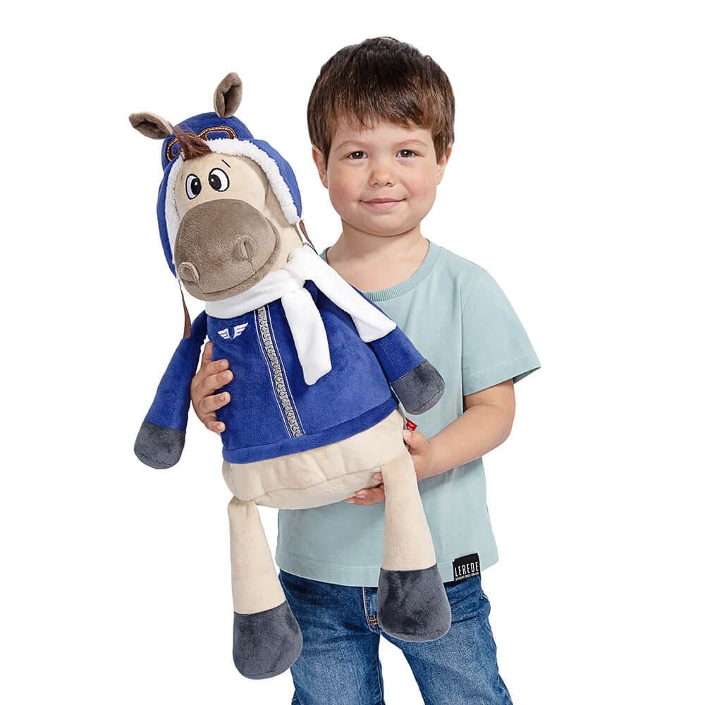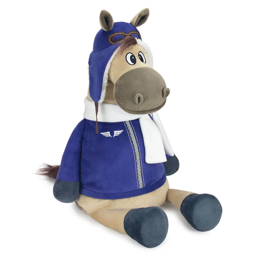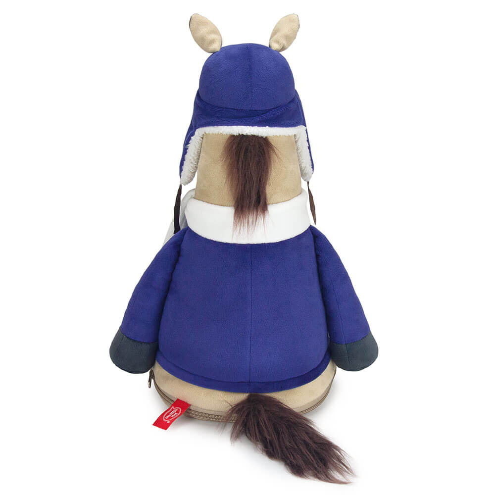 Оригинальная новогодняя текстильная упаковка для сладостей вместимостью до 1300 г. Мягкая игрушка с карманом на молнии конь Роберт.
